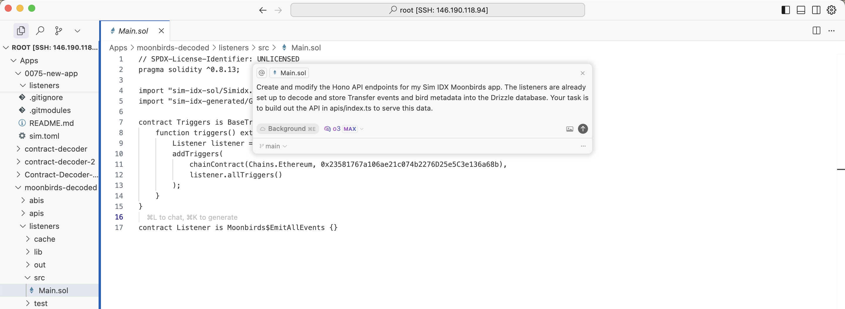 to open the control panel. - Write a detailed prompt for your agent (e.g., “Create a new Solidity listener for the USDC Transfer event and a corresponding TypeScript API endpoint to query transfers by address”).